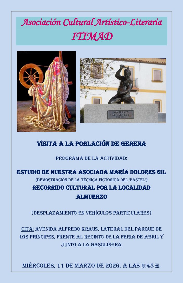 En esta jornada tendremos una actividad externa. Nos desplazaremos en vehículos particulares a Gerena. En esta localidad visitaremos el estudio de dibujos y pinturas de nuestra asociada María Dolores Gil, en él nos hará una demostración de cómo se realiza la pintura de un objeto mediante la técnica del pastel. (Adjuntamos cartel).