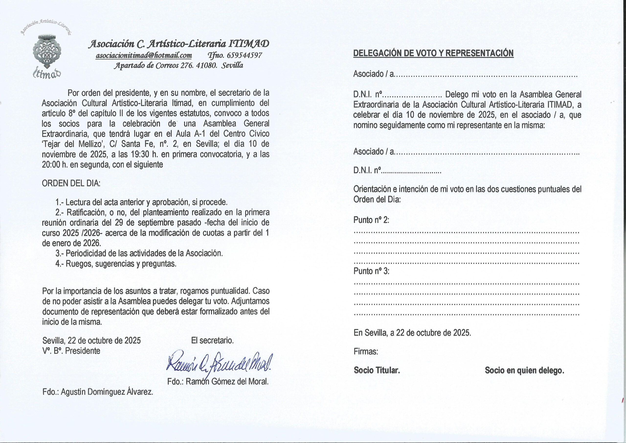 Adjuntamos la convocatoria de la Asamblea General Extraordinaria a celebrar el próximo día 10 de noviembre, a las 20:00 h, en el Aula 1 del Centro Cívico ‘Tejar del Mellizo’, en segunda convocatoria.